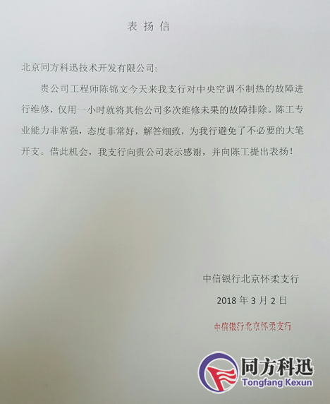 3月2日,中信銀行北京懷柔支行為我公司寄來一封表揚(yáng)信,對我公司及工作人員的服務(wù)表示高度贊揚(yáng),并且當(dāng)場熱切表示將我公司作為其空調(diào)維保服務(wù)唯一指定公司!